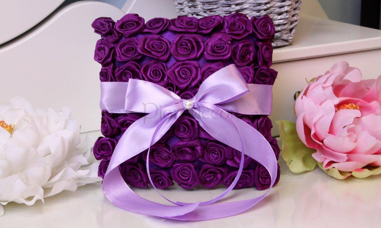 Вариантов изготовления подушечек очень много. Выбор зависит от того вида рукоделия, которым вы владеете. Например, ее можно связать в виде красного сердечка или сшить из шелковой ткани, декорированной нежным кружевом: