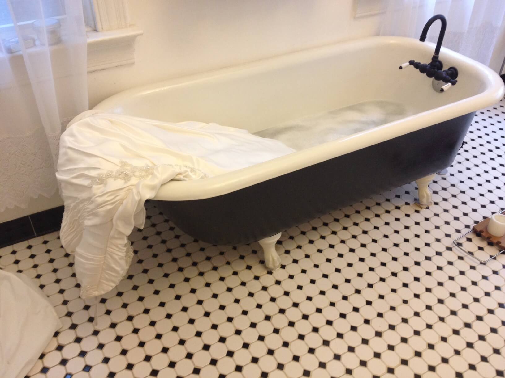 Метод отличается простотой и бюджетностью. Для отпаривания набирается целая ванна кипятка, а платье подвешивается над ней на расстоянии около 20 см от воды. Несмотря на плюсы, имеется целый ряд недостатков: