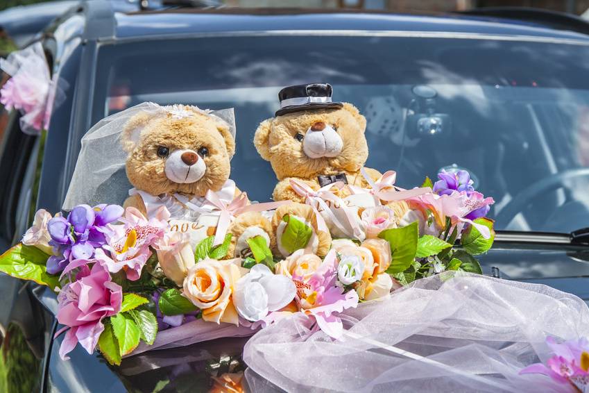 Большой популярностью в последнее время пользуются композиции с мягкими игрушками. Они закрепляются на капоте машины, либо на крыше, вместе с традиционными свадебными кольцами.
