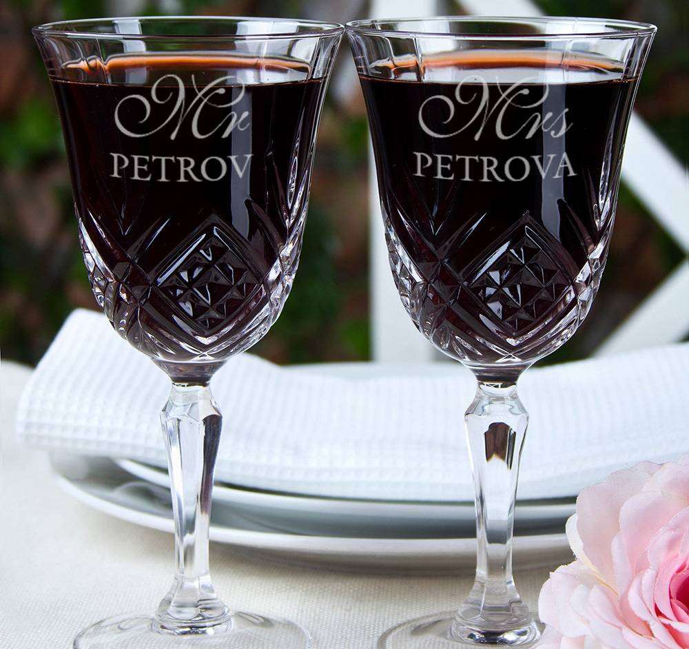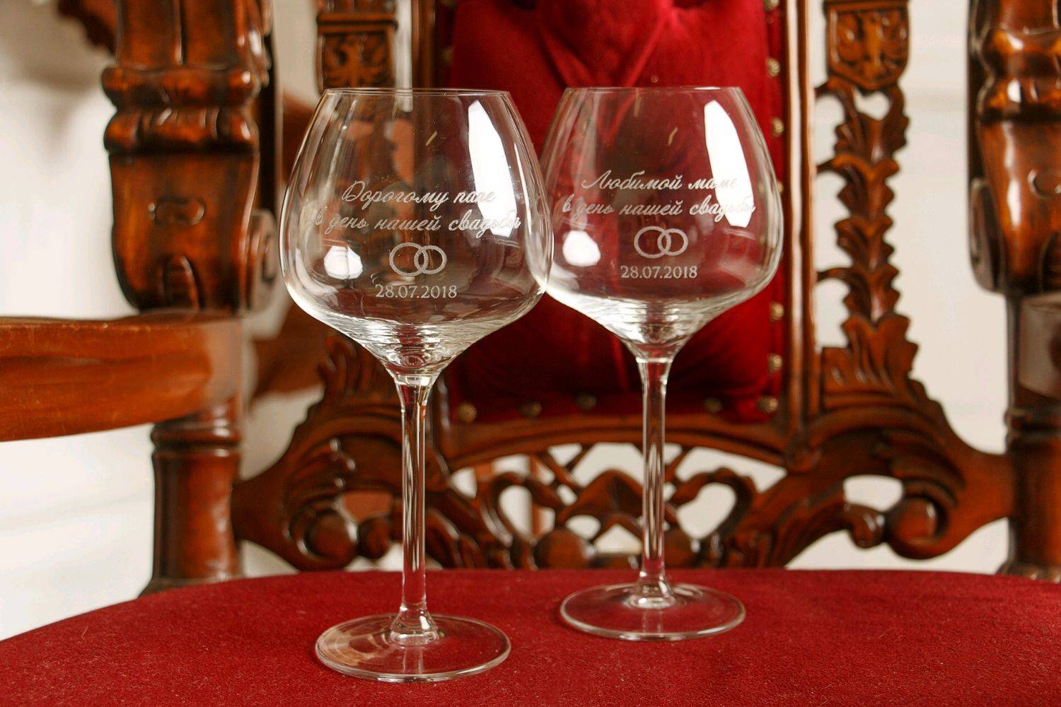 Время бокалов для вина с гравировкой, как правило, считается торжественное мероприятие, свадьба.