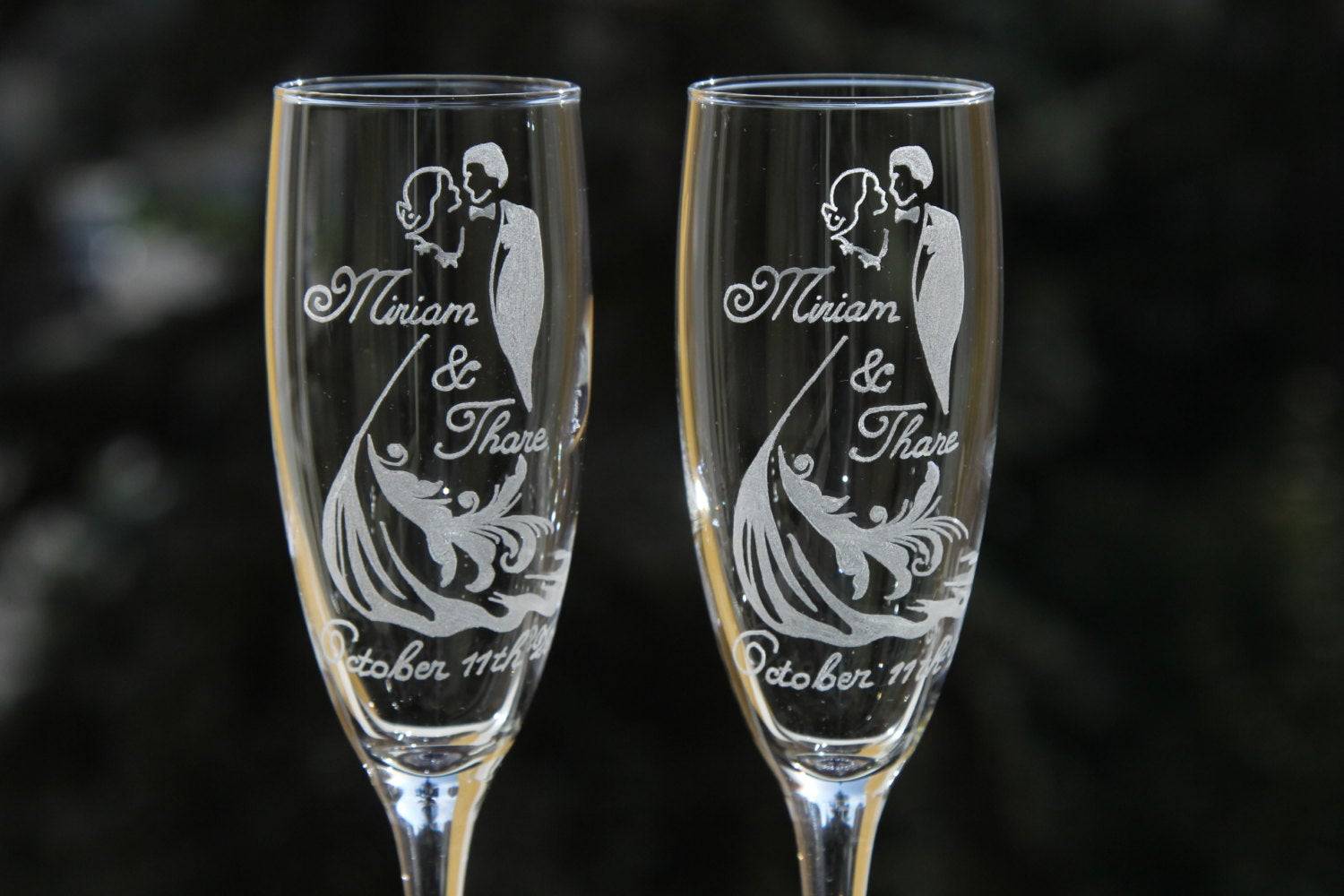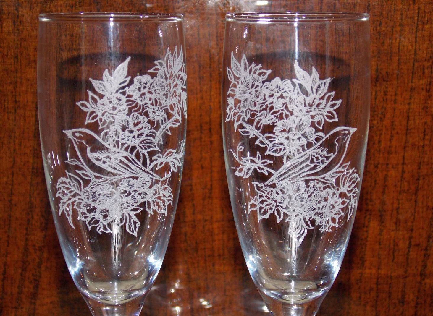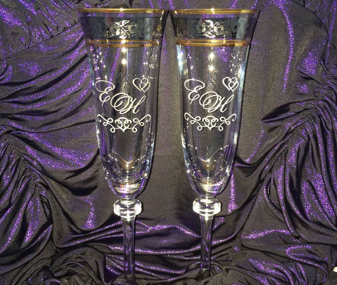 Этот способ дает возможность нанести на поверхность довольно сложные рисунки, оригинальные надписи и замысловатые узоры. Лазерная гравировка применяется при выполнении особых заказов. Таким способом можно сделать надписи на бокалах, оформленных специально не только для жениха и невесты, но и для их свидетелей и родителей.