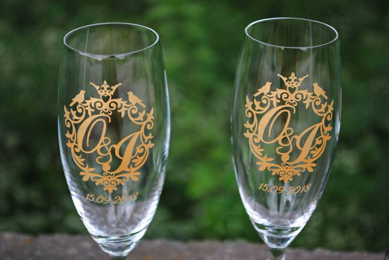 Это может быть шутка, игривое пожелание или надпись на английском языке. Чаще всего на бокалах пишут имена молодых или заглавные буквы этих имен, изображая их в виде вензеля и указывая дату рождения семьи. В другом случае на поверхности стекла появляется изображение голубков или лебедей, обручальных колец, сердечек.