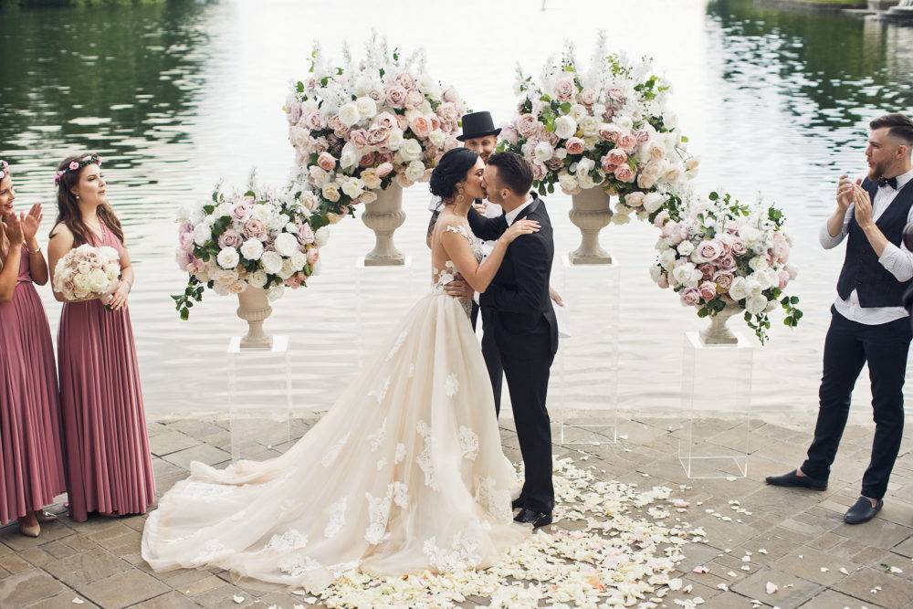 На берегу озера, где молодожены обменивались клятвами, был установлен цветочный шатер, на оформление которого было потрачено 2 миллиона рублей.