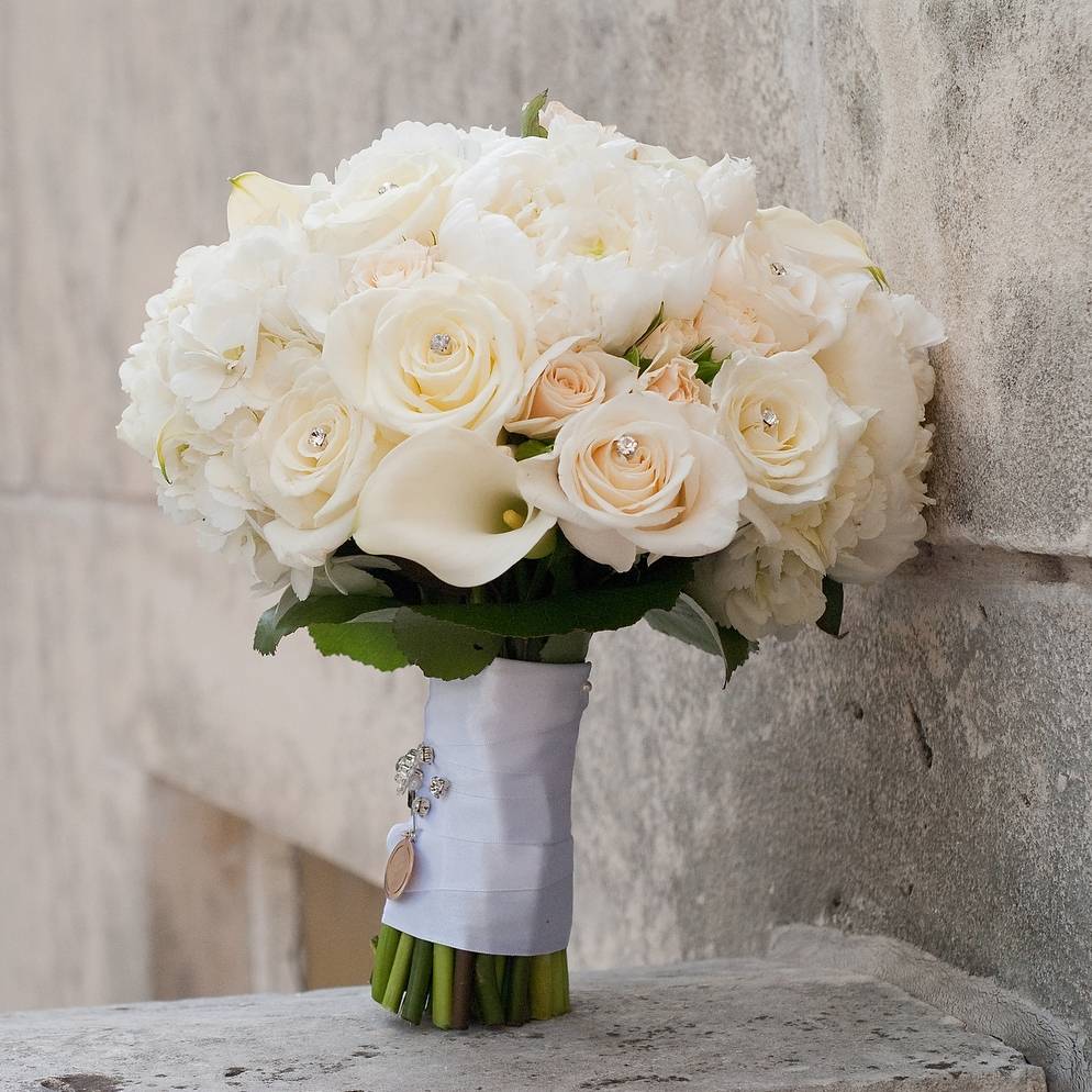 Классика жанра — это букет из белых роз на свадьбе. Чтобы немного осовременить такой букет, вы можете к каждому бутону приклеить стразик или яркий камешек, или же жемчужинку. Он сразу же заиграет более интересно. Особенно это актуально для невест, у которых в образе есть украшения с такими камнями.