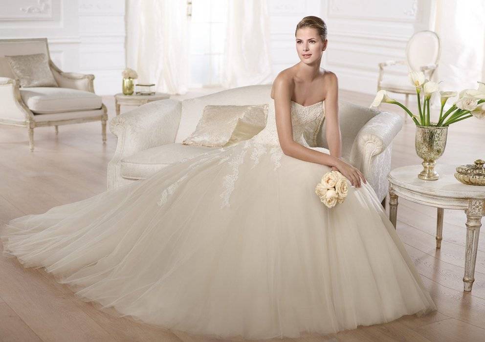 Свадебное платье цвета айвори, то есть оттенка слоновой кости, с вариациями: