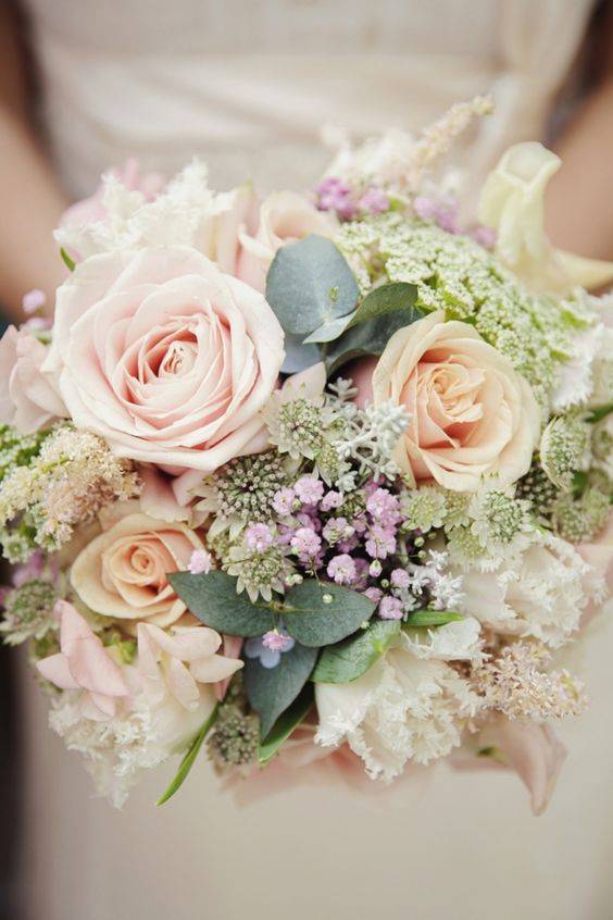 При составлении свадебного букета из нескольких пудровых цветов важно учитывать интенсивность их оттенков. Более яркие и насыщенные цветы следует располагать в центре букета, а самые светлые по его краям