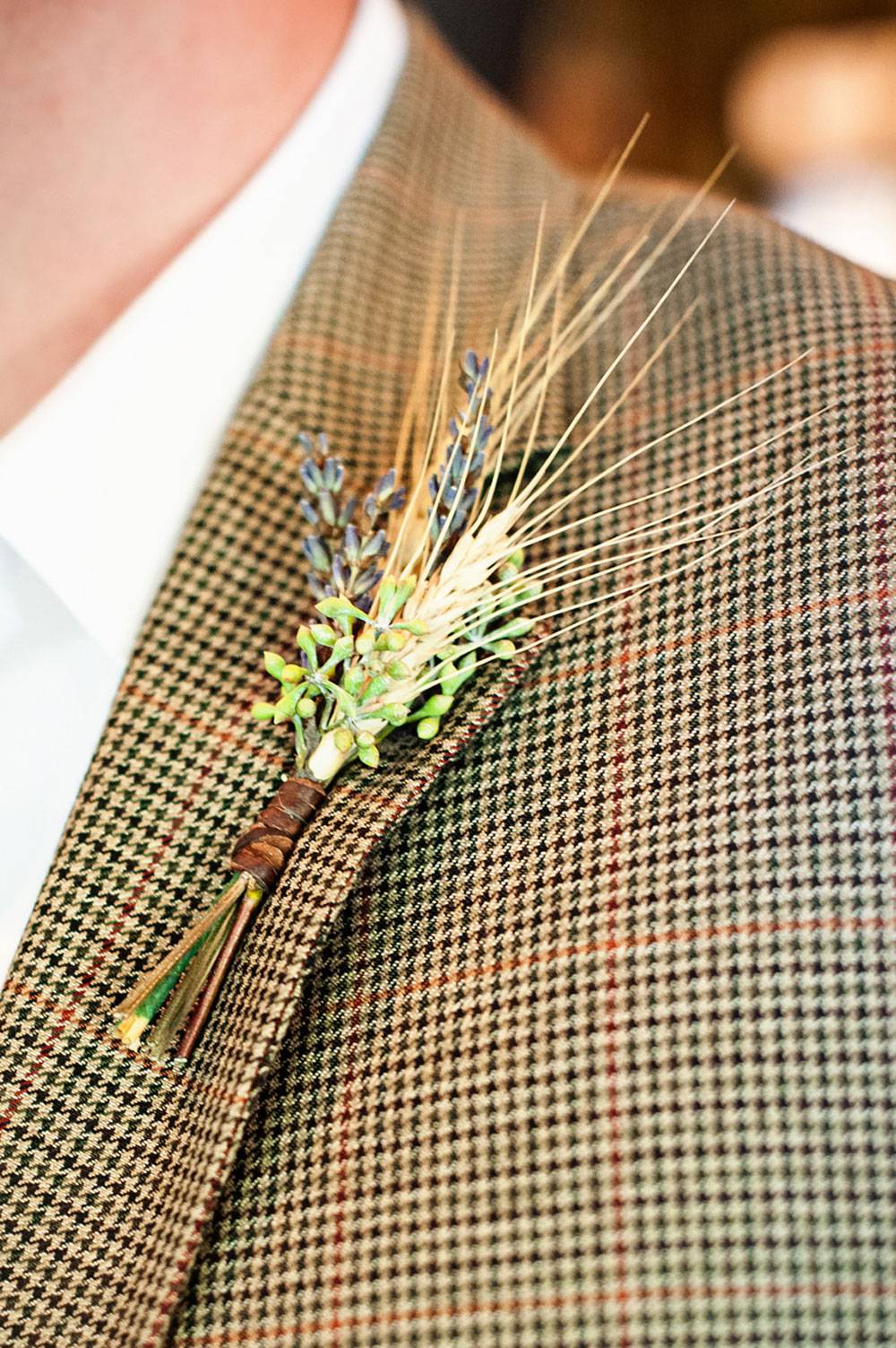 Бутоньерка для гостей, которую можно прикрепить на наряд, делается по похожему принципу. При этом вместо цветка можно использовать цветы лаванды, красивые перья, листья, ленты и даже лесные шишки — главное, чтобы по цвету и стилистике они подходили к свадебным нарядам будущих молодожёнов.