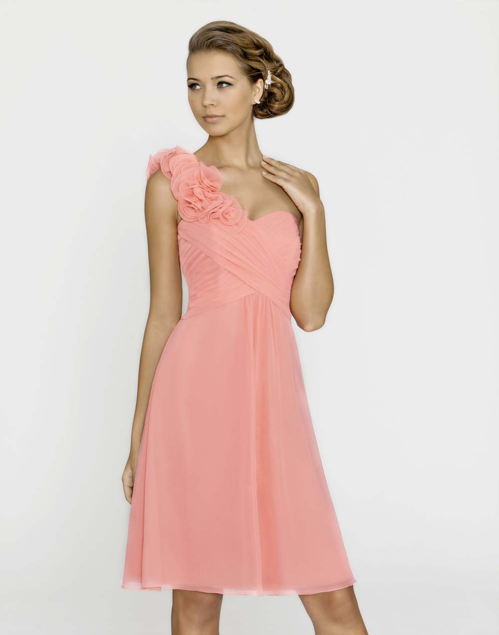 Всегда актуальные, стильные, популярные – короткие платья. Такие варианты тоже отлично подходят для свадебного торжества. Праздничности наряду может добавить правильно подобранная прическа подружки невесты, её аксессуары.
