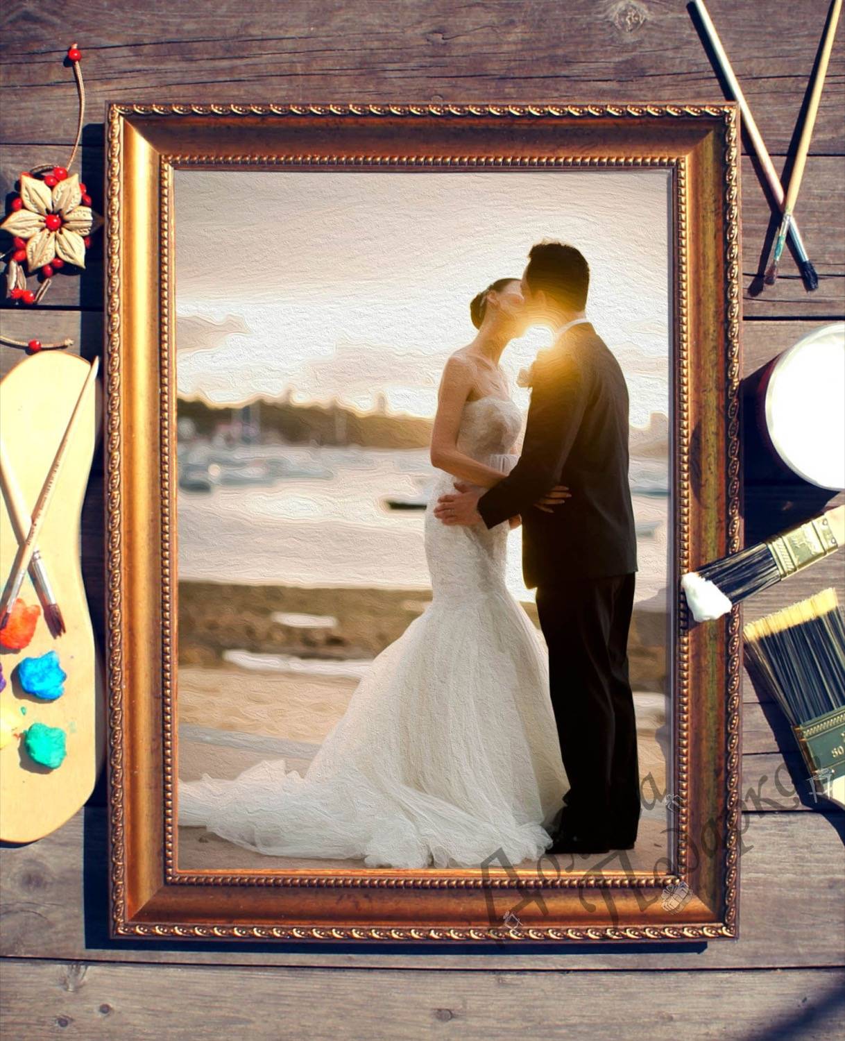 Изображение в золотой рамке. Это может быть воспроизведение ваших любимых супругов художника, а также их картина. Такая картина должна быть заказана из художника, который рисует с фотографии.