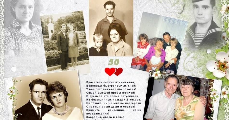 С полвека вы живете плечо на плече. Мы очень рады поздравить вас с годовщиной золотой свадьбы. Желаем вам много здоровья, много лет любви и жизни в гармонии, в окружении заботливых детей и внуков!