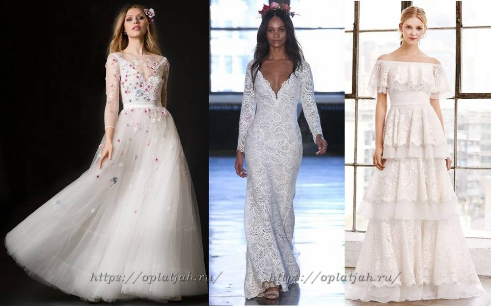 Есть среди них цельные одежды, привлекающие внимание лаконизмом или интригующими вырезами на лифе. Многие из них отличаются ажурным верхом с прозрачным рукавом из кружева или гипюра с вышивкой