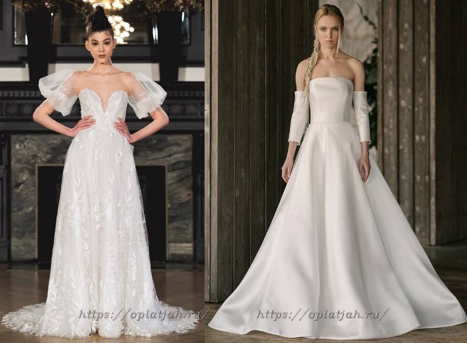 Рукава в этом сезоне удостоились особенного внимания от стилистов и мировых дизайнеров. Свадебные платья без рукавов легко дополняются недостающими деталями в виде фонарика, с прямыми или широкими расходящимися манжетами из кружева. Так что один наряд можно превратить в скромное платье для венчание и ультрасовременный убор для веселья.
