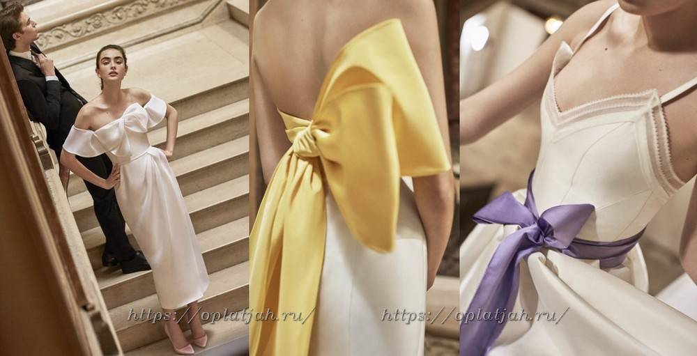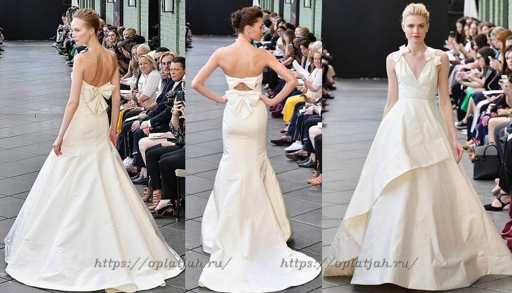 Мы уже упоминали, что завязки в виде бантов на плечах украшаются многие свадебные платья 2019. Модные тенденции (фото ниже) включи наряды с одним или двумя бантами на спине, талии или лифе подвенечного убора.