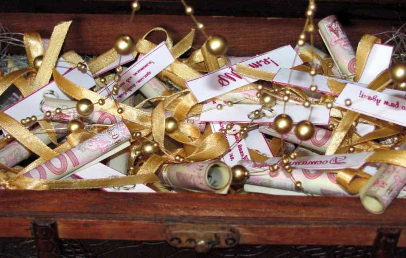 Казна может быть выполнена в форме сердца, шкатулки, сундука, домика, торта и т. д. Декор можно сделать из лент, органзы, кружева, гофрированной бумаги, цветов, страз, полубусин и полужемчужин, бисера, ракушек. Боковые стороны можно украсить фотографиями молодых, тематическими рисунками — голуби, лебеди, сердце, кольца, коты на крыше.