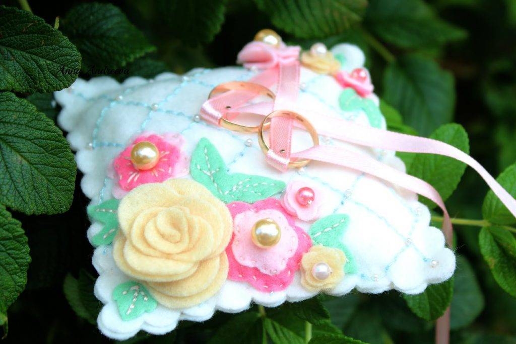 Подушечка для колец. Аксессуар в данном исполнении выглядит очень нежно, может быть украшен фетровыми цветками, завитушками.