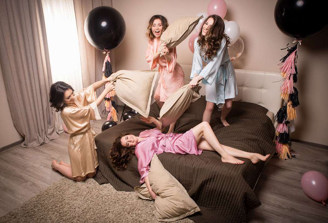 - Вечеринка в пижамах. Своеобразная «классика жанра». Студия имитирует спальню, девушки надевают пижамы, халаты, сорочки, «пушистые» тапочки. Очень забавно на фото смотрятся «битвы» подушками, а атмосферно – гадания, дружеские беседы под одеялом.
