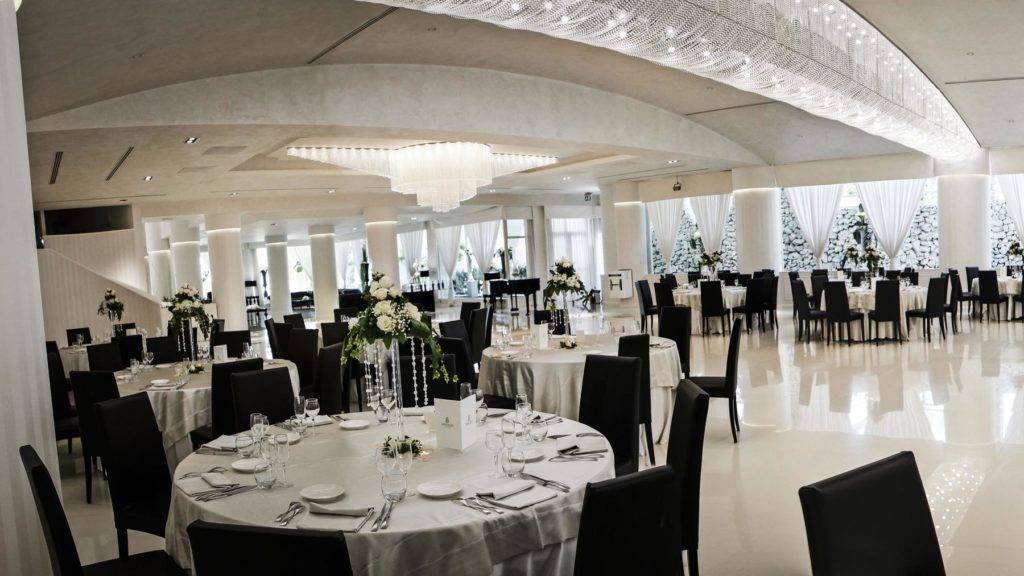 Цветовое решение праздничного зала основывается на черно-белых тонах. Нотку романтики в эту монохромную палитру добавляют небольшие вкрапления светло-розовых, персиковых или бежевых тонов.