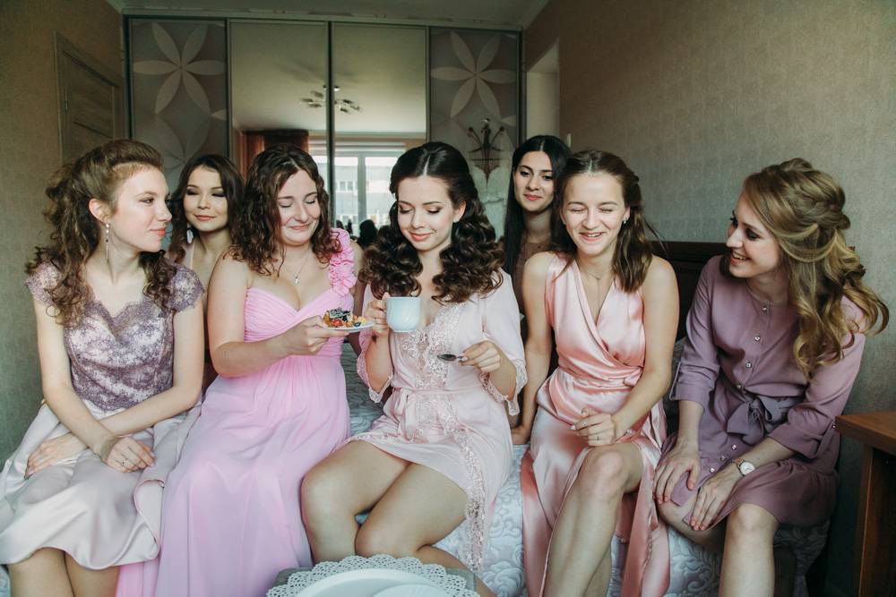 Фото с лучшими подругами. Если невеста проводит утро с подружками, можно сделать несколько совместных кадров. Это могут быть дружеские объятия или просто случайные кадры, наполненные «живыми» эмоциями.