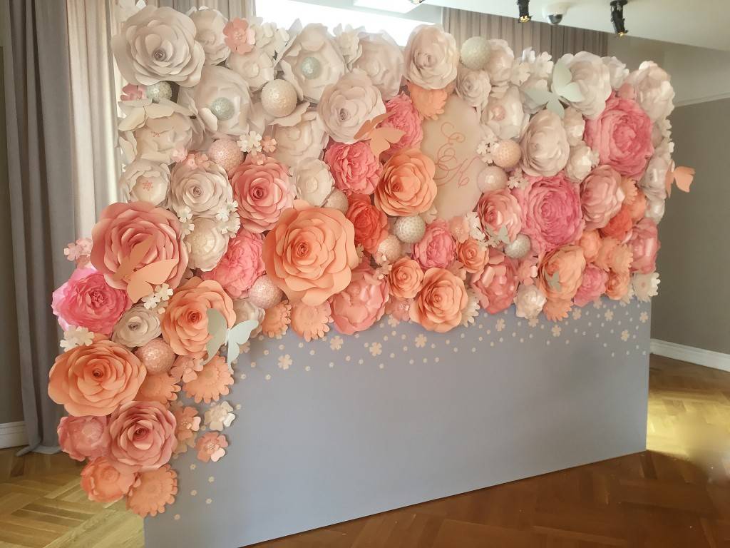 Фон, украшенный цветами – можно использовать как живые растения, так и искусственные. Особенно красиво в помещении выглядят огромные бумажные бутоны. Они могут быть как приклеены к задней стене, так и быть установленными на ножках. В последнем случае также делают ветки и листья, чтобы макет получился наиболее приближенным к настоящему растению.