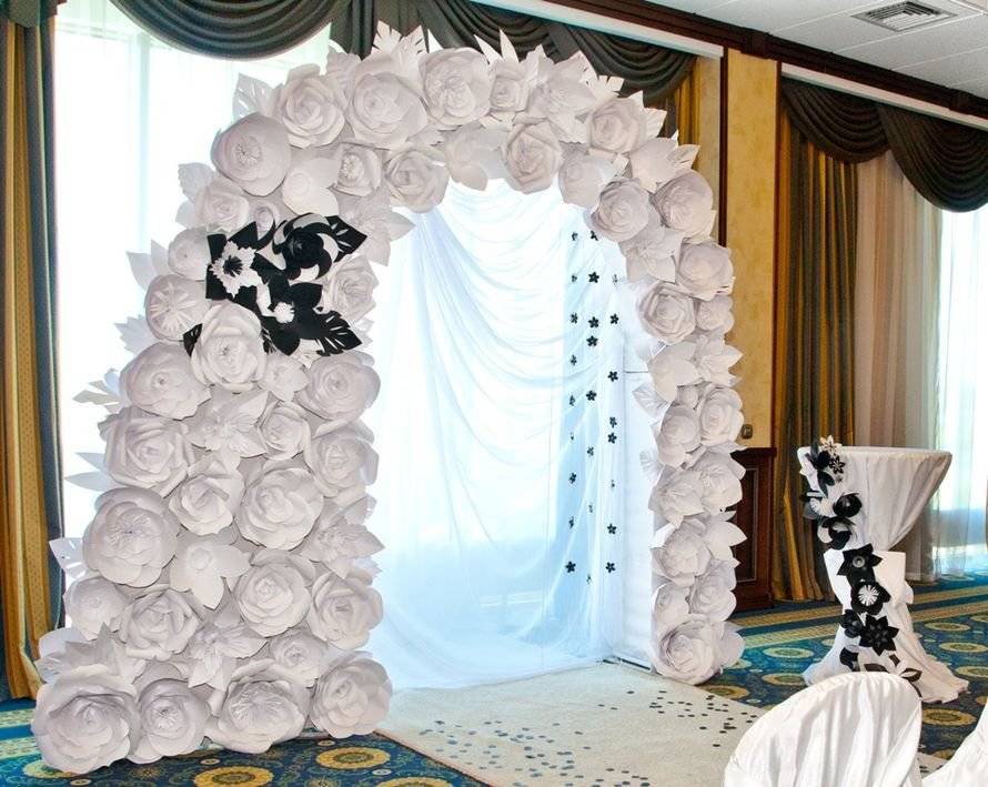 - Из бумажных цветов сделать подобие шторки. Цветки нанизать, начиная светлыми оттенками и заканчивая темными. Такую шторку повесить на ветку дерева или на деревянную арку.
