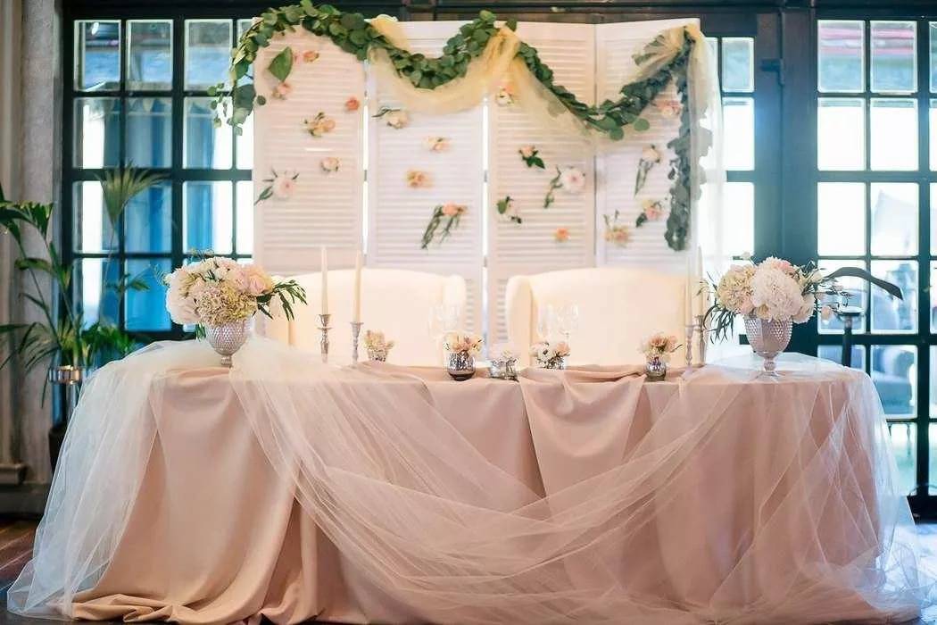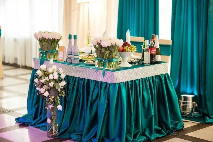 Прежде чем скупать рулоны атласа и органзы, следует уточнить у администрации ресторана, какое украшение стола на свадьбу предусмотрено у них. Возможно, основные моменты вас вполне устроят и вам понадобится только докупить несколько метров красивой ткани того цвета, в котором вы задумали свадебное торжество, чтобы подчеркнуть тематику. Если «юбка» стола вас устраивает, вы можете просто сделать красивые сваги и украсить их в местах соединения букетиками цветами или бантами. Драпировки из такой же ткани можно расположить на стене позади стола.