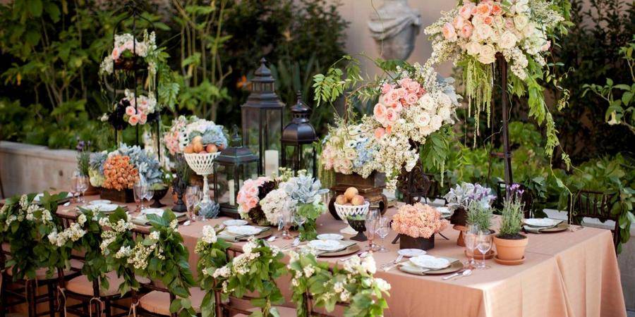 Сочетайте природные материалы с роскошными предметами. Также используйте большое количество цветов пастельных оттенков и зелени.