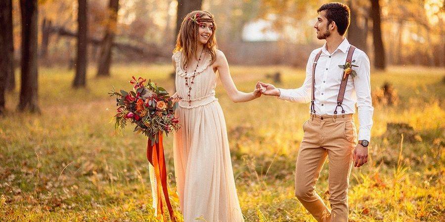 Девушке подойдет свободный летящий крой наряда, сшитый из хлопка или кружева, а парню использовать хлопковый материал для костюма, запонки из дерева и галстук-бабочку.