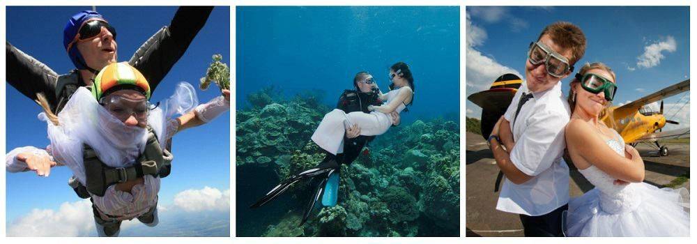Вариант для смелых пар — экстремальная свадьба. Вместе прыгнуть с парашютом, заключить брак под водой или продемонстрировать друг другу силу вашей любви, прыгнув с тарзанки, — такое событие точно запомнится навсегда. Также уровень адреналина повысят восхождение на гору и полет на воздушном шаре, дельтаплане или самолете. Конечно, много гостей на такую свадьбу не позовешь: это могут быть либо самые близкие люди, которые станут свидетелями вашего сумасшедшего поступка, либо друзья, разделяющие ваши интересы и, возможно, готовые испытать острые ощущения вместе с вами. Завершить экстремальный праздник можно небольшим перекусом и, конечно, фотографиями на память.