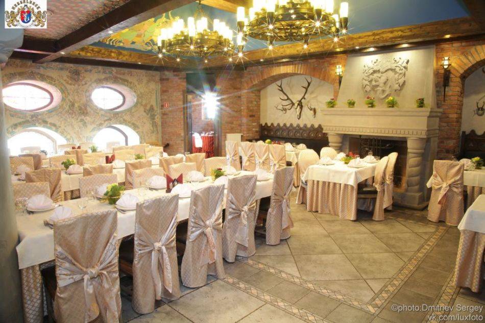 - Место проведения. В идеале это должен быть замок с соответствующим антуражем. Если вам удастся найти такое помещение, то вам не придется тратиться на дополнительный декор. Если у вас нет возможности арендовать такое помещение, тогда найдите красивый ресторан и просто украсьте его так, как вам нужно. Добиться желаемого результата вам помогут тяжелые гобелены, свечи в старинных канделябрах, мечи и чучела животных. Также обязательно позаботьтесь чтобы для молодоженов были предусмотрены два красивых трона