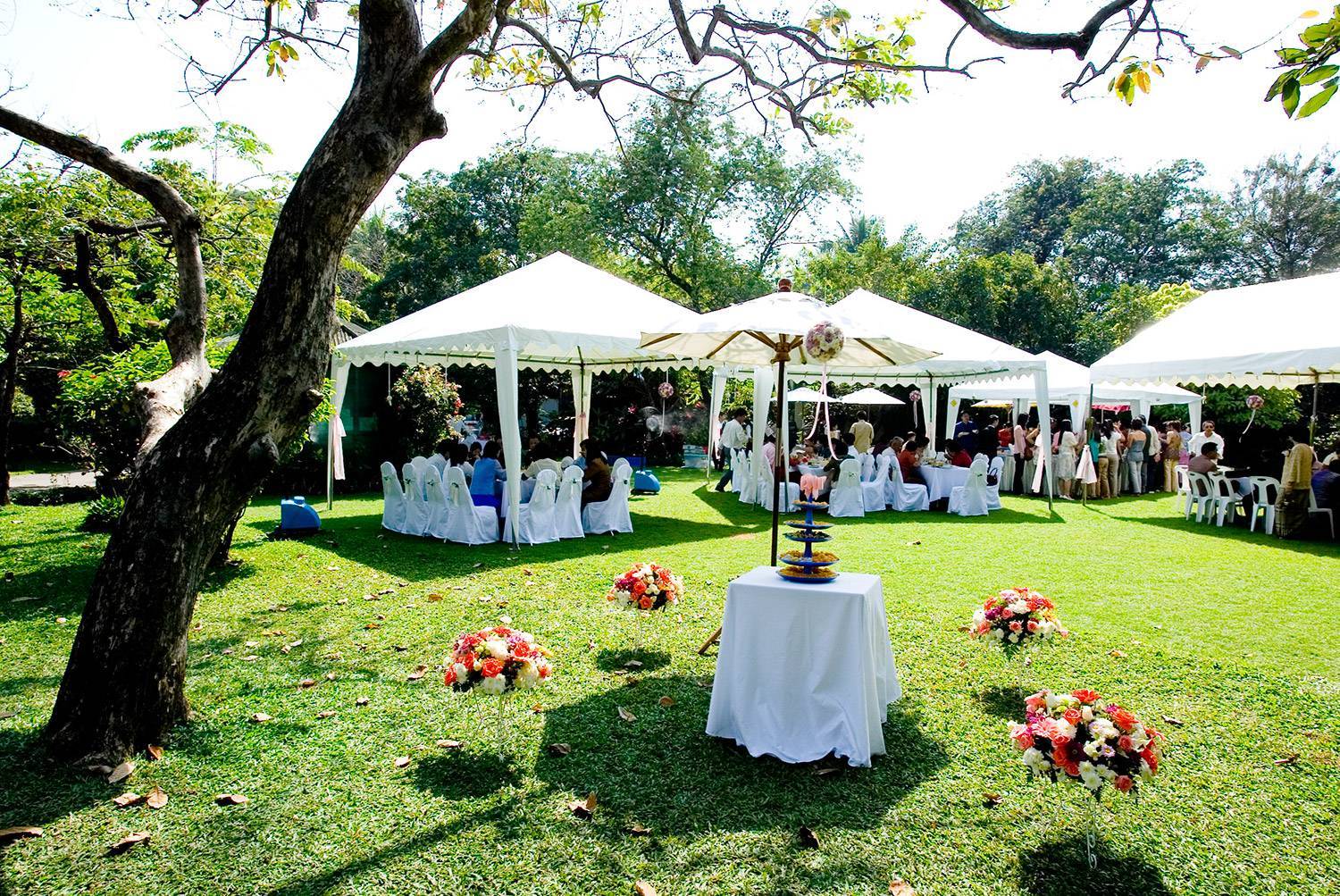 Для банкета, в рассматриваемых локациях, часто имеются различные беседки или же навесные шатры, на случай дождя. При их отсутствии, можно заказать специальные мобильные навесы или переместиться в здание, если вдруг погода испортится.