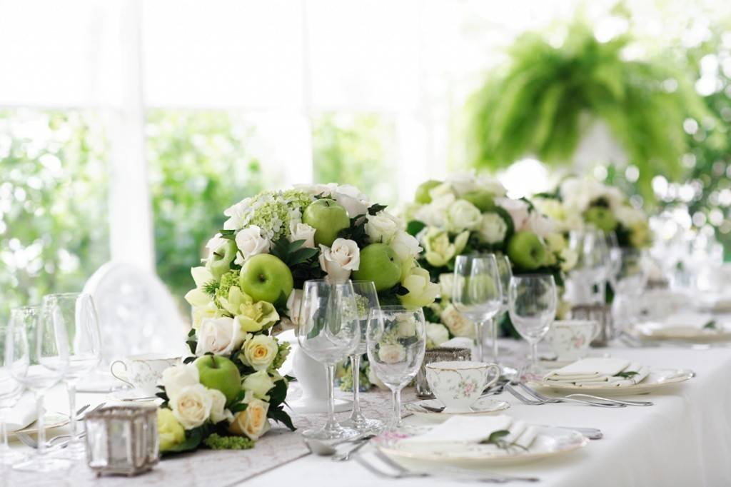 Цветы. Редкая свадьба обходится без живых цветов. Если вы хотите создать цветочную композицию самостоятельно, не поленитесь все же проконсультироваться с флористом. Не все желания невесты будут уместны на свадьбе. Например, люди, знающие, как правильно украсить зал на свадьбу, скажут вам, что для гирлянд и потолка подойдут только плотные бутоны, которые не будут покрывать пыльцой одежду гостей и новобрачных. Класть цветы в сервировочные тарелки также плохая идея, так как бутоны могут быть обработаны химическими веществами, продлевающими жизнь цветам, но угрожающими пищеварению гостей
