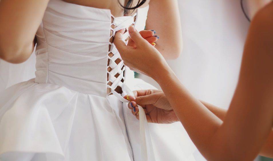 Чтобы правильно зашнуровать платье на невесте, необходимо иметь сноровку и предельную аккуратность. Лучше, чтобы этим занимались два человека.