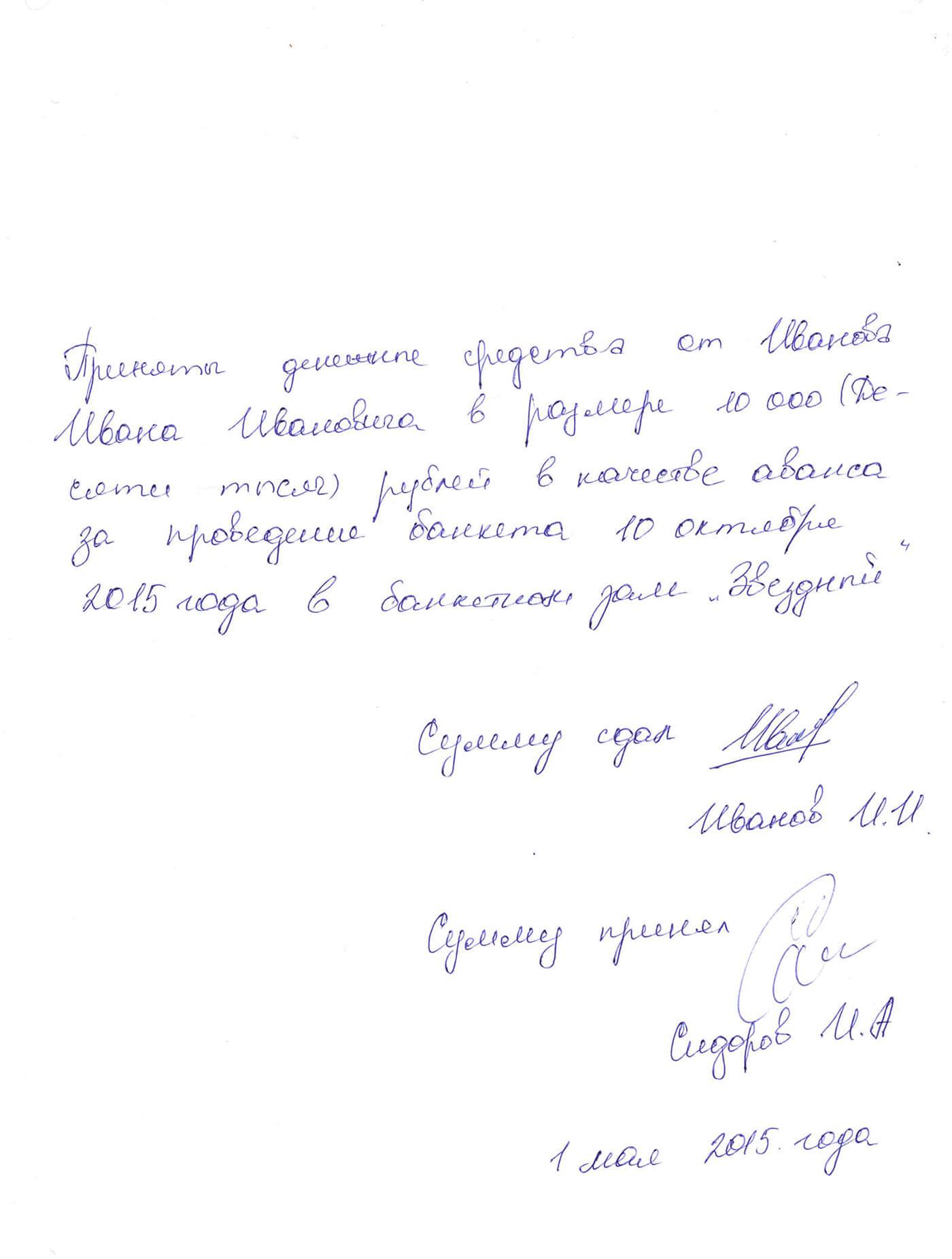 Так случилось, что первый ресторан, который мы выбрали, сгорел дотла. Задаток и неустойку нам не вернули, потому что мы не заключили договор, а ограничились только распиской, которая не имела юридической значимости.