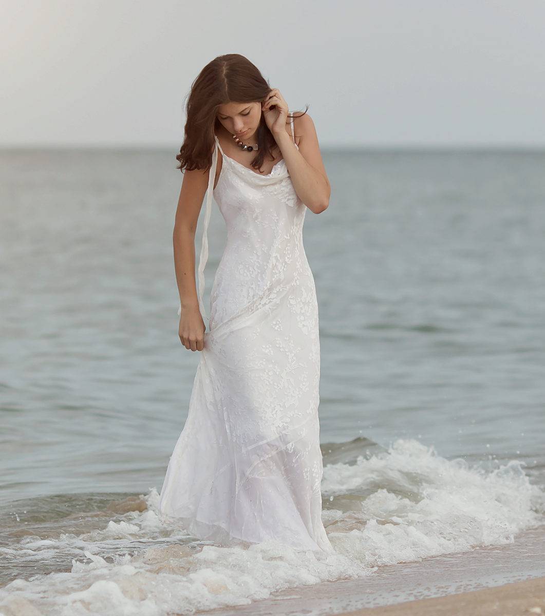 Образ, создаваемый платьем с завышенной талией, органично вписывается в романтичную атмосферу морского побережья и напоминает древний миф, по которому Афродита родилась из морской пены.