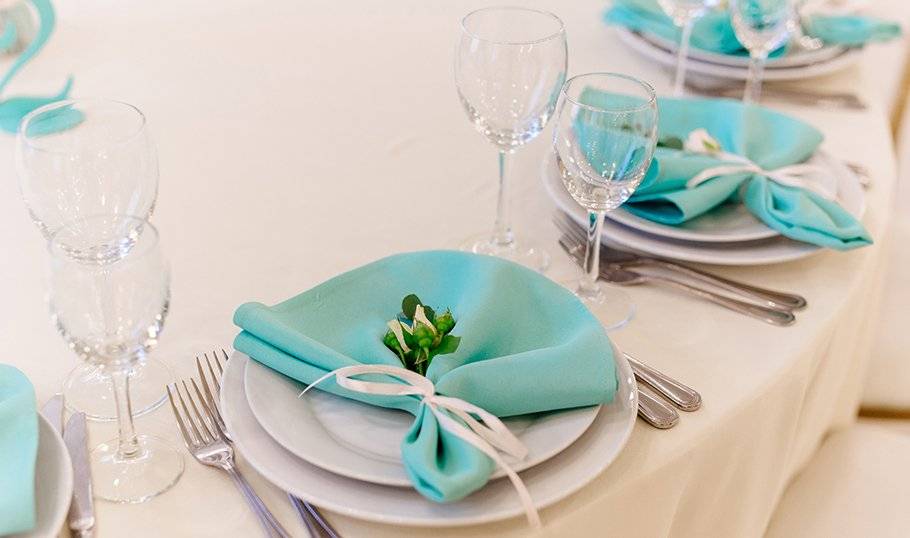 - Скатерть голубого цвета. Очень стильным дополнением к скатерти станут сервировочные салфетки в комплекте с кольцами из бирюзы.