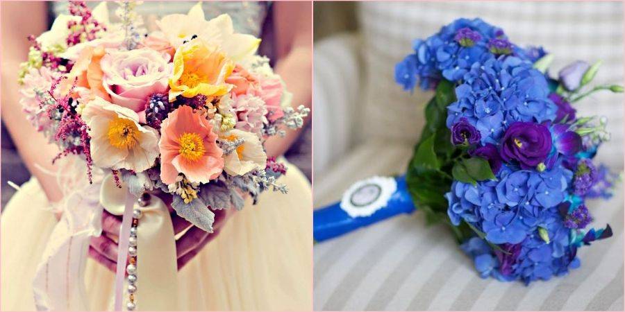 - Гортензия. Из маленьких соцветий получается аккуратный женственный свадебный букет невесты с синими цветами, который подойдёт к скромно украшенному платью. Кроме того, это очень стойкий цветок, поэтому можно не бояться за его сохранность в течение всего дня.
