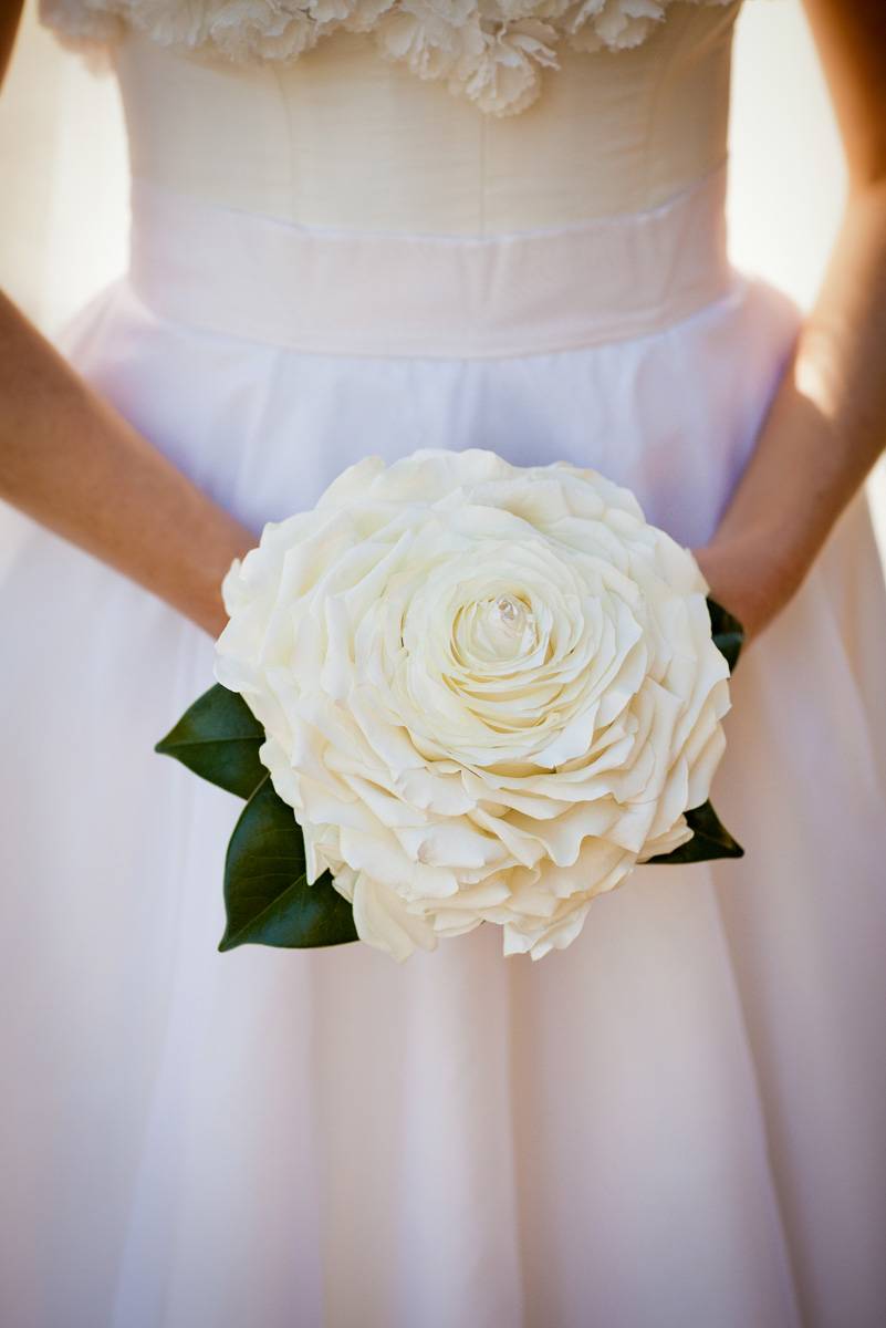 - Если в платье новобрачной много декора, то выбирайте букетик с большими и объемными деталями.