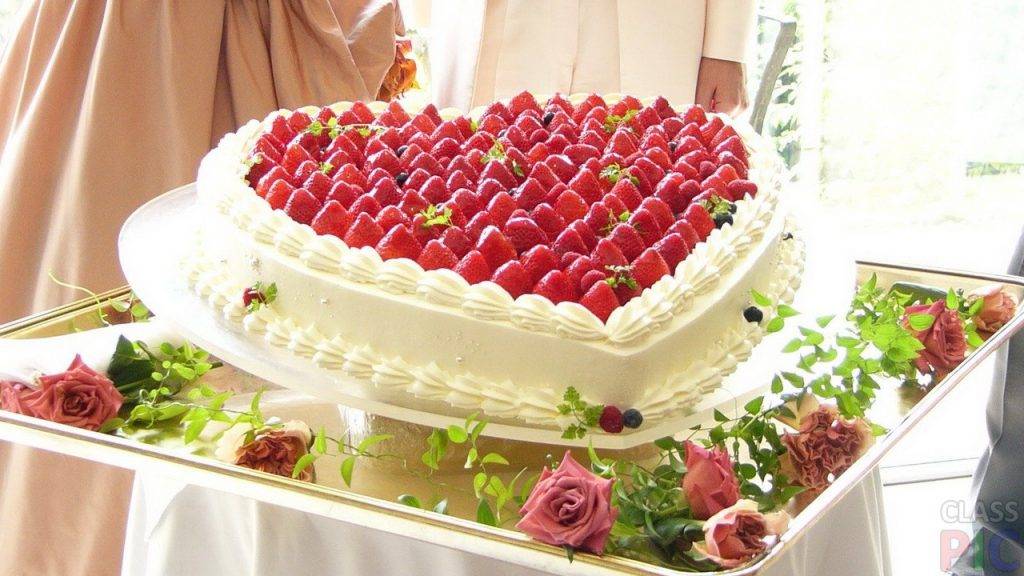 Учитывая необычную тематику праздника, торт должен соответствовать клубничному направлению. Часто кондитеры используют клубнику в качестве эффектного украшения, дополняя ее шоколадом или взбитыми сливками. Начинка же, торта может быть абсолютно любой, все зависит лишь от индивидуальных предпочтений жениха и невесты.