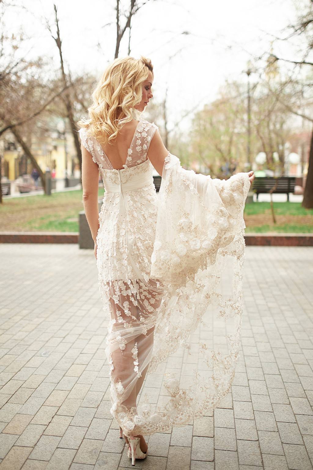 - Если ваше свадебное платье легкое и элегантное, не делайте каких-то сложных сооружений на голове, достаточно распустить локоны или частично заплести волосы.