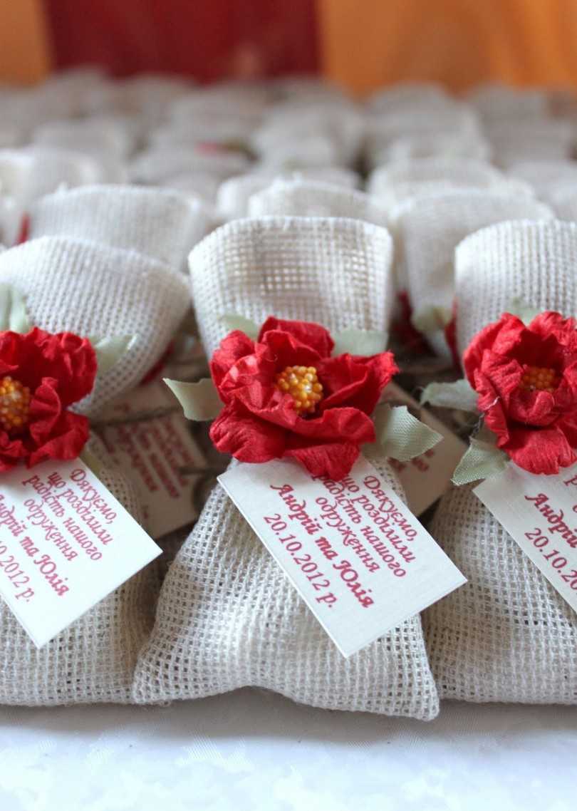 Необязательно класть предметы, ассоциирующиеся со свадьбой, можно использовать любые приятные мелочи, которые пригодятся гостям. Осенью, например, можно подарить всем красиво упакованные зонтики, летом – солнечные очки. Если не знаете, что кладут в бонбоньерки на зимнюю свадьбу, то наполните мешочек елочными игрушками или конфетами. Такие подарки обязательно понравятся гостям.