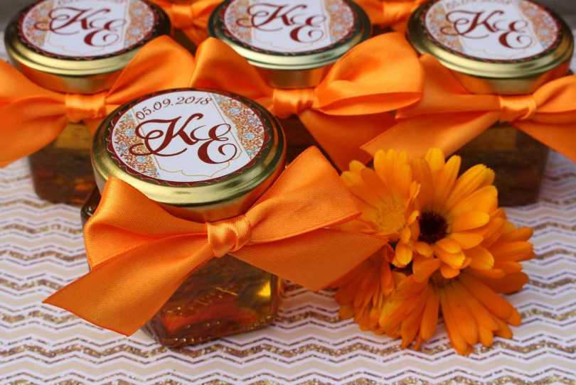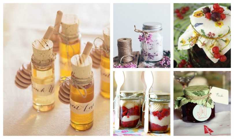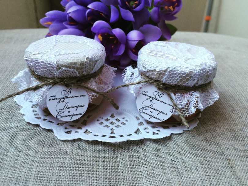 - Мед или варенье. Домашние сладости в красиво украшенных баночках будут смотреться необычно на свадьбе и пригодятся всем гостям;