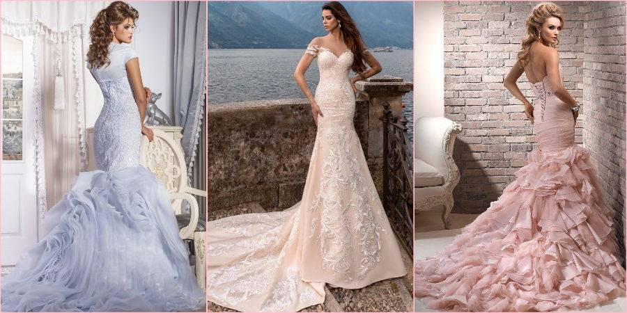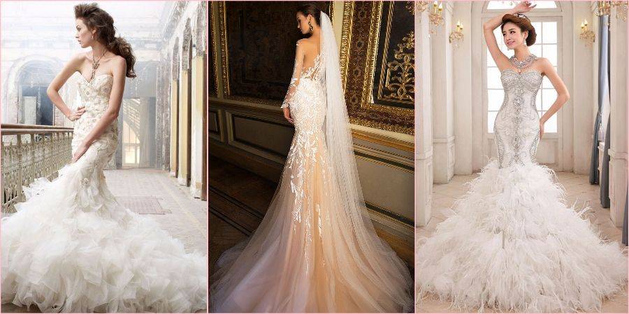 Модное платье-рыбка удлиняет фигуру, придавая ей пропорции песочных часов с акцентом на спине и бедрах. Модели со шлейфом из шифона отличаются невероятно изящным силуэтом и лучше всего смотрятся на высоких девушках