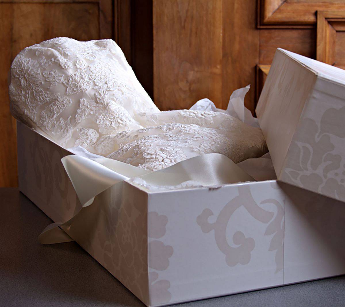 После свадьбы обязательно сдайте платье невесты в химчистку (в случае сильных загрязнений не позже 7-10 дней после праздника) и храните отдельно от свадебных аксессуаров во вместительной картонной коробке, которая хорошо пропускает воздух, чтобы белая ткань не пожелтела. Дно коробки устелите тонкой белой оберточной бумагой, которую необходимо менять каждые полгода.