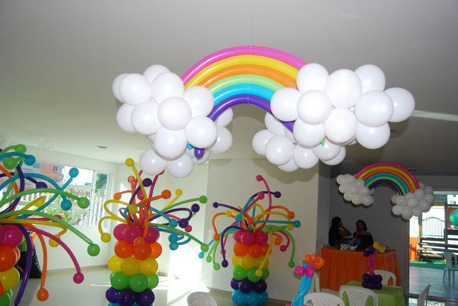 Третий вариант — соберите радугу из длинных разноцветных шаров. Их концы соедините с обычными круглыми белыми шарами. Вариант идеален для небольшого помещения.