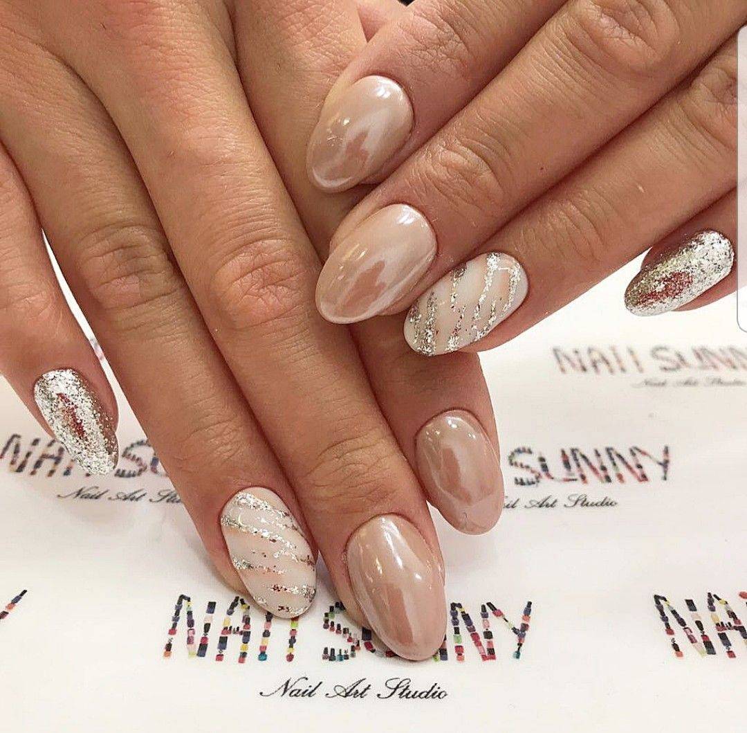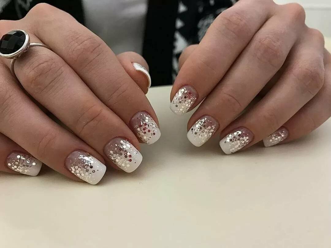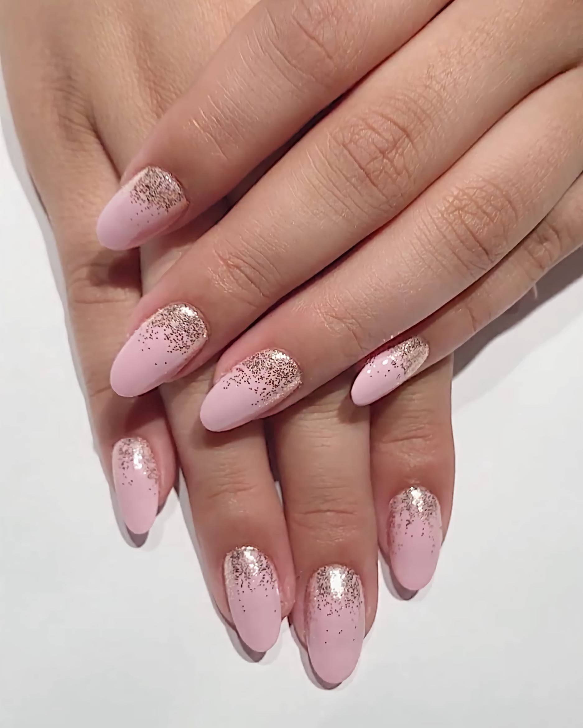 Эти тонкие прозрачные ногти напоминают нам о бокале с шампанским. Они идеально подходят для торжества. Нарисуйте два слоя розового оттенка, а дальше добавьте омбре и блестки. Для такой точности используйте специальную губку, чтобы нанести ее на ногти. Не забудьте о глянцевом верхнем слое.