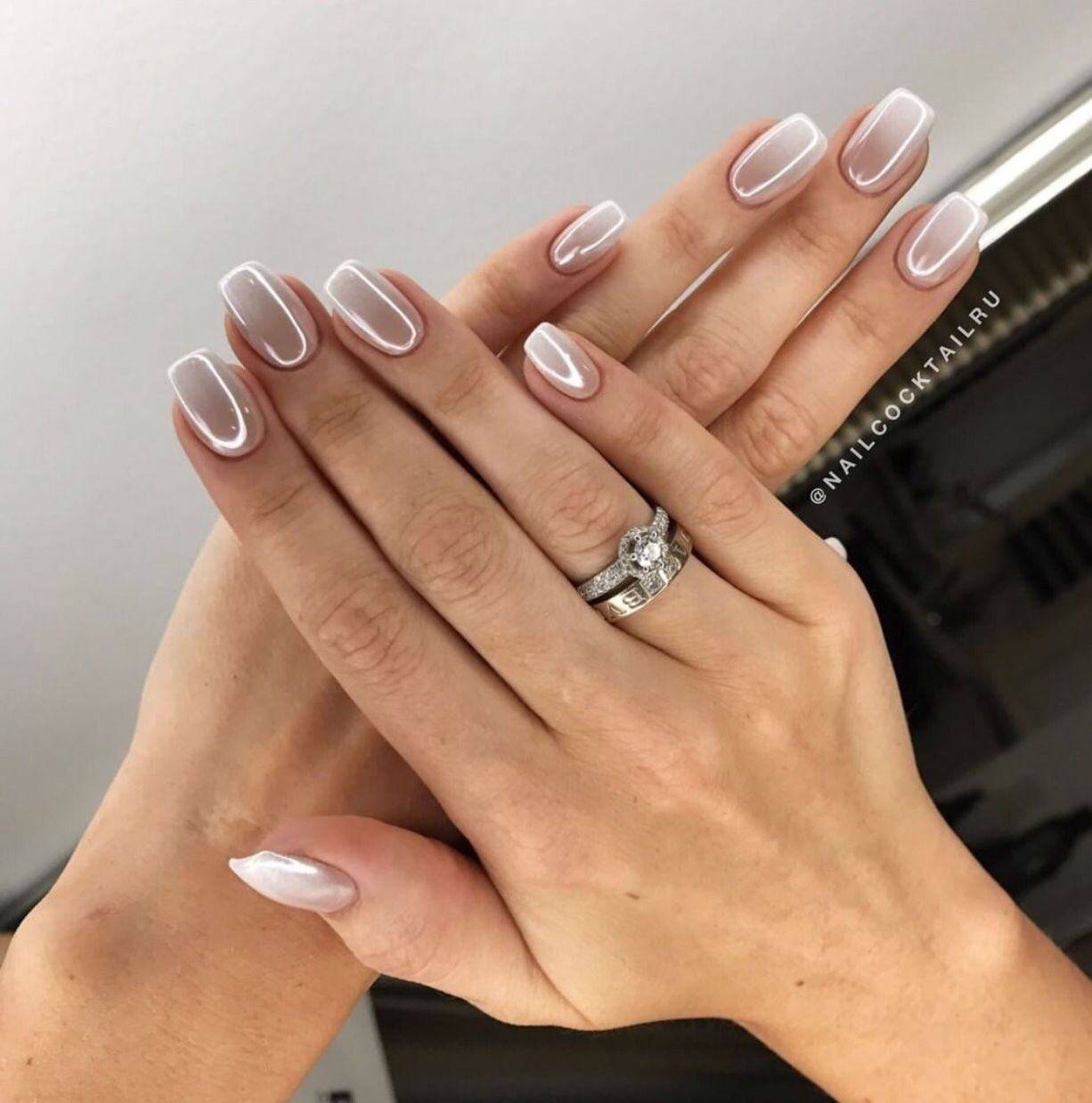 Эти свадебные ногти находятся вне времени. Из многих видов свадебного маникюра – этот базовый стиль никогда не подведет. Используйте розовый и кремовый оттенки. Также вы можете использовать традиционную полироль с глянцевым верхним слоем или гель лак для идеального глянцевого покрытия.