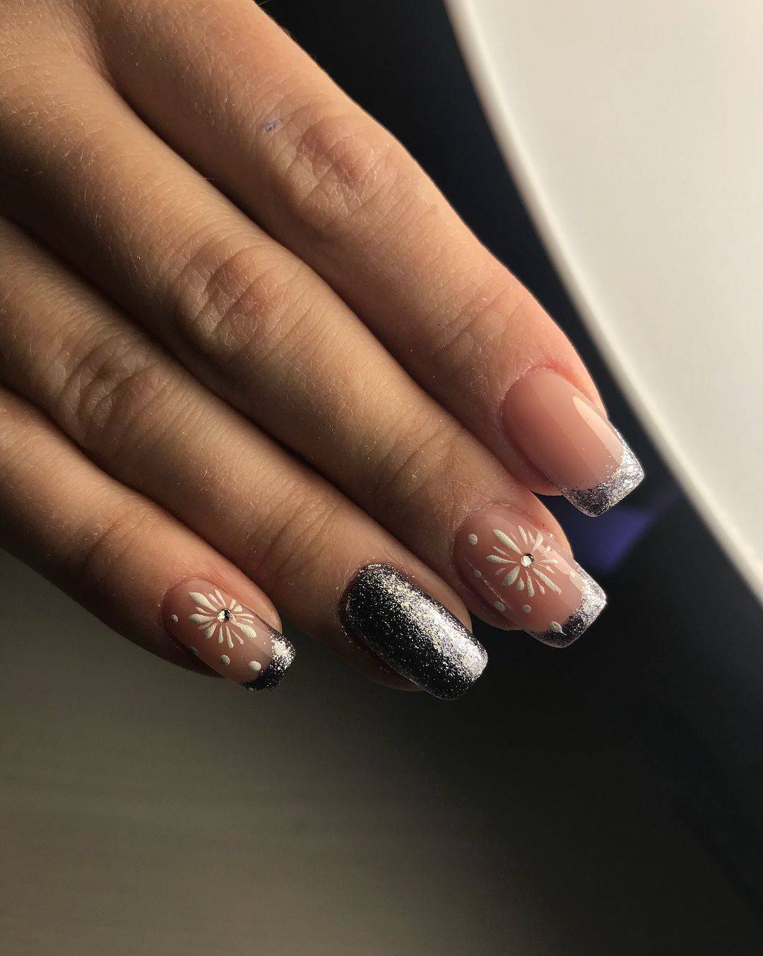 Посмотрите, как нежно и красиво смотрится френч, украшенный рисунками цветов, на коротких ноготках.
