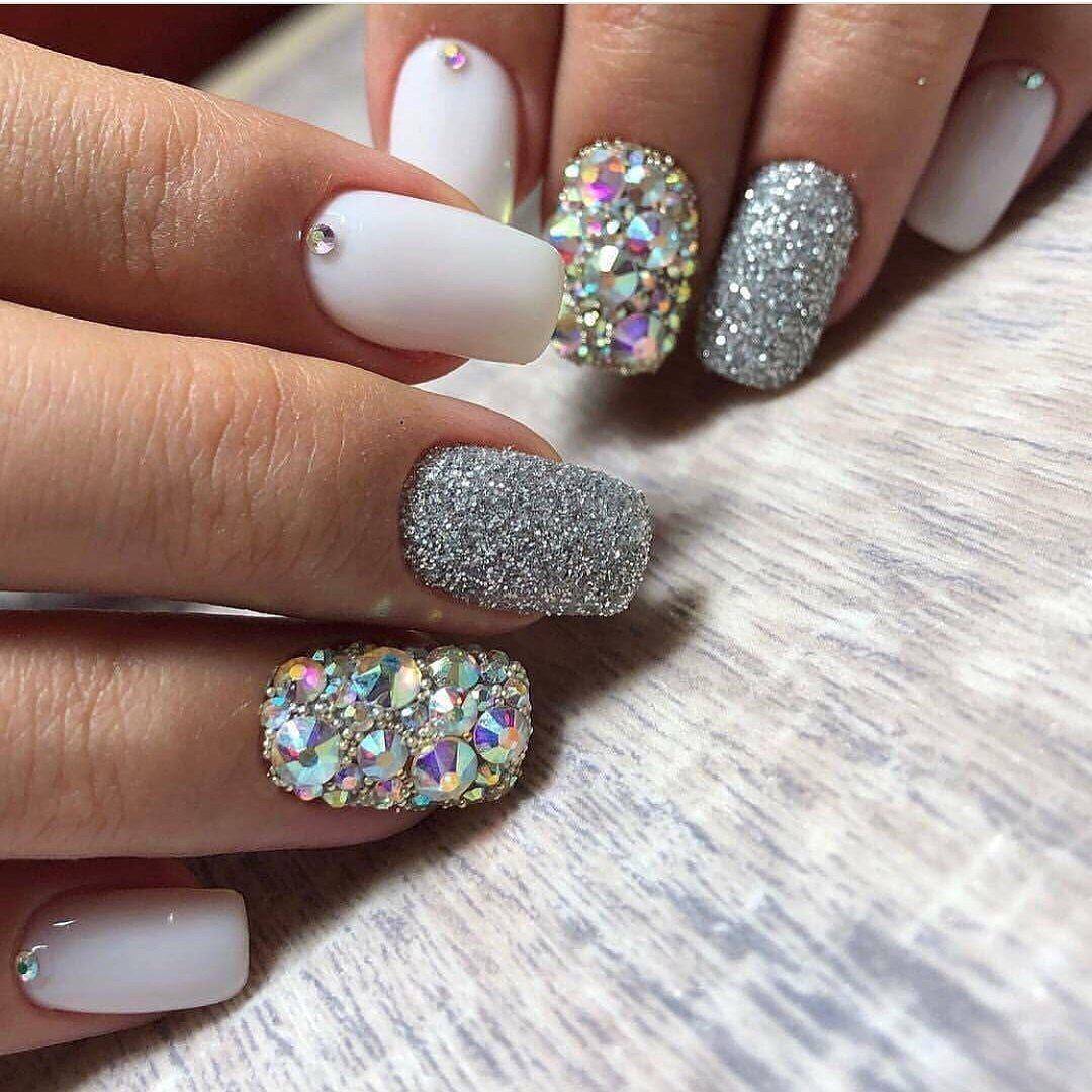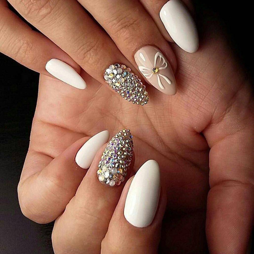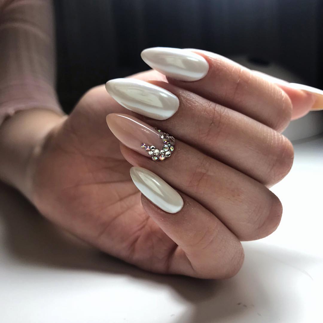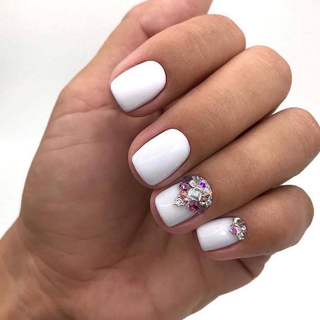На длинных ногтях квадратной формы очень красиво и стильно будет смотреться белый гель-лак с блестками и стразами.