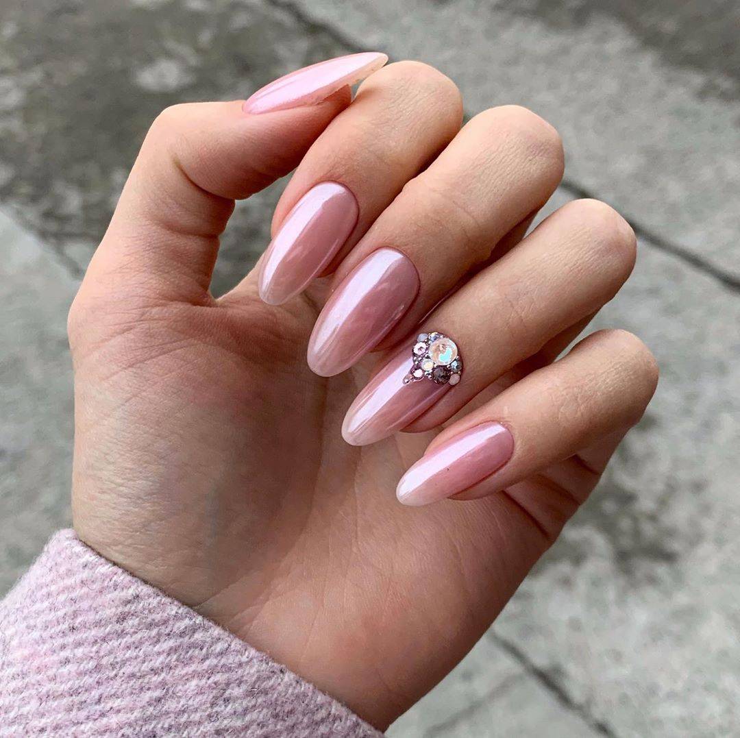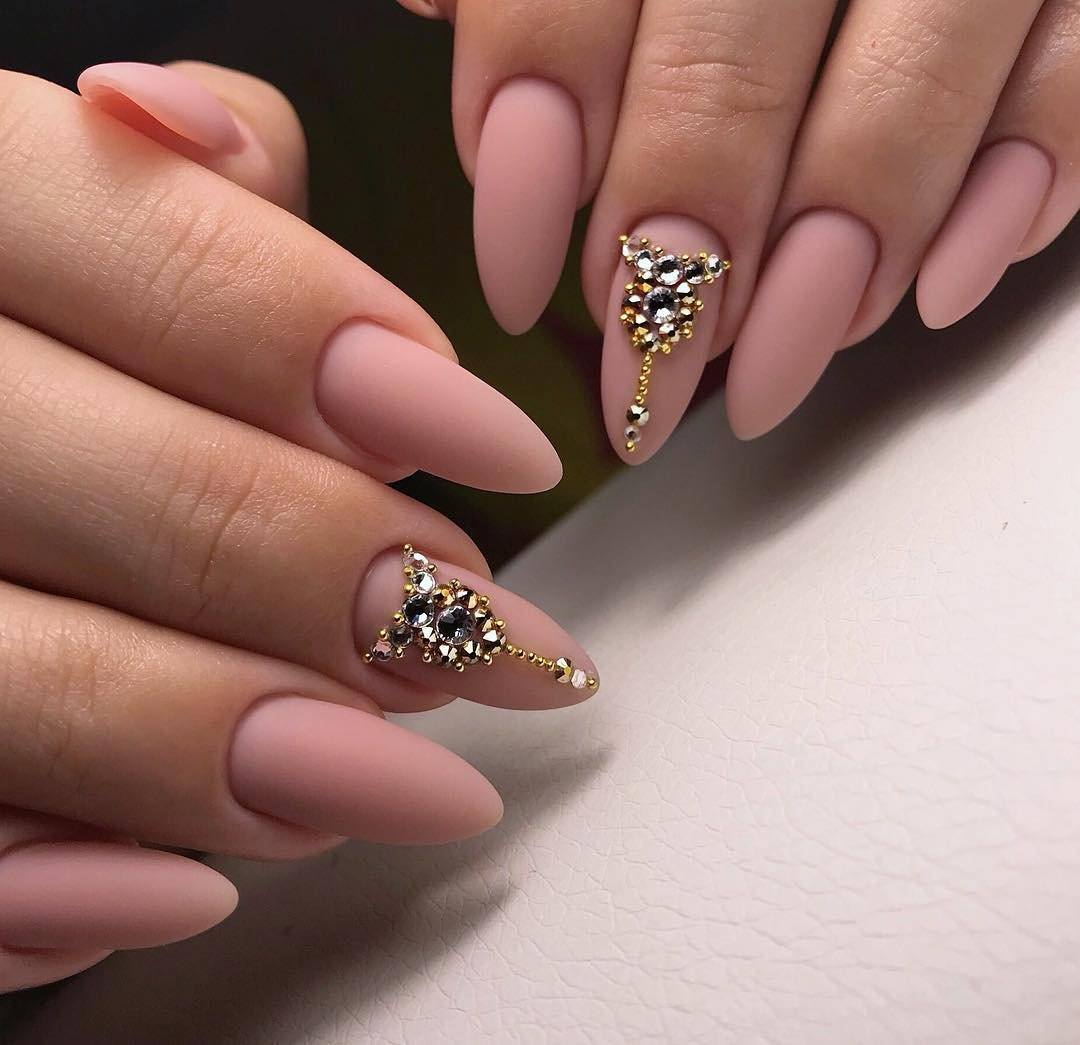 Здесь нас учат, насколько потрясающе может выглядеть балетно-розовый маникюр, просто добавив несколько драгоценных камней у основания каждого безымянного пальца.
