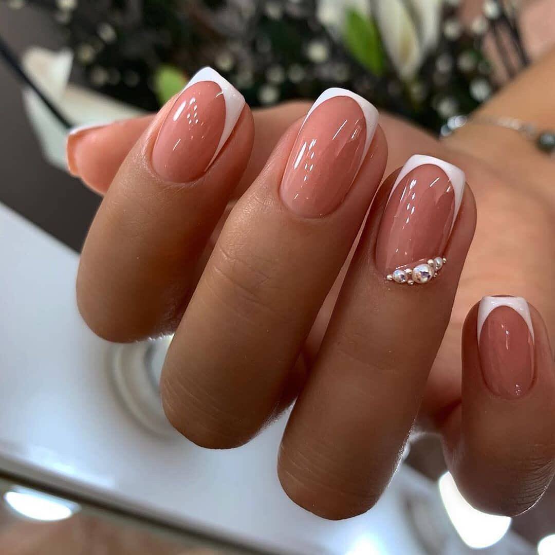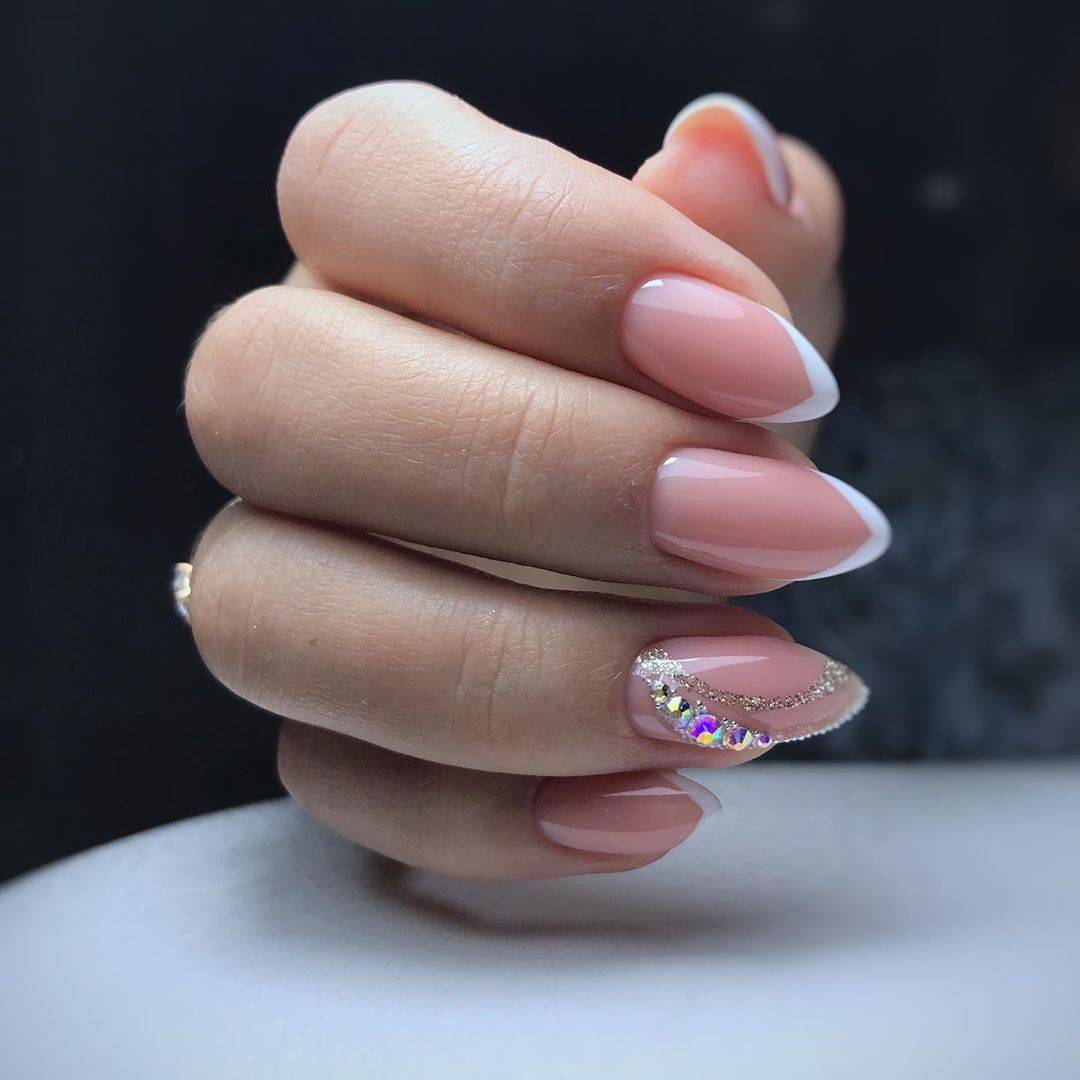 На длинных ногтях миндальной формы очень стильно будет смотреться френч со стразами на нюдовом фоне.